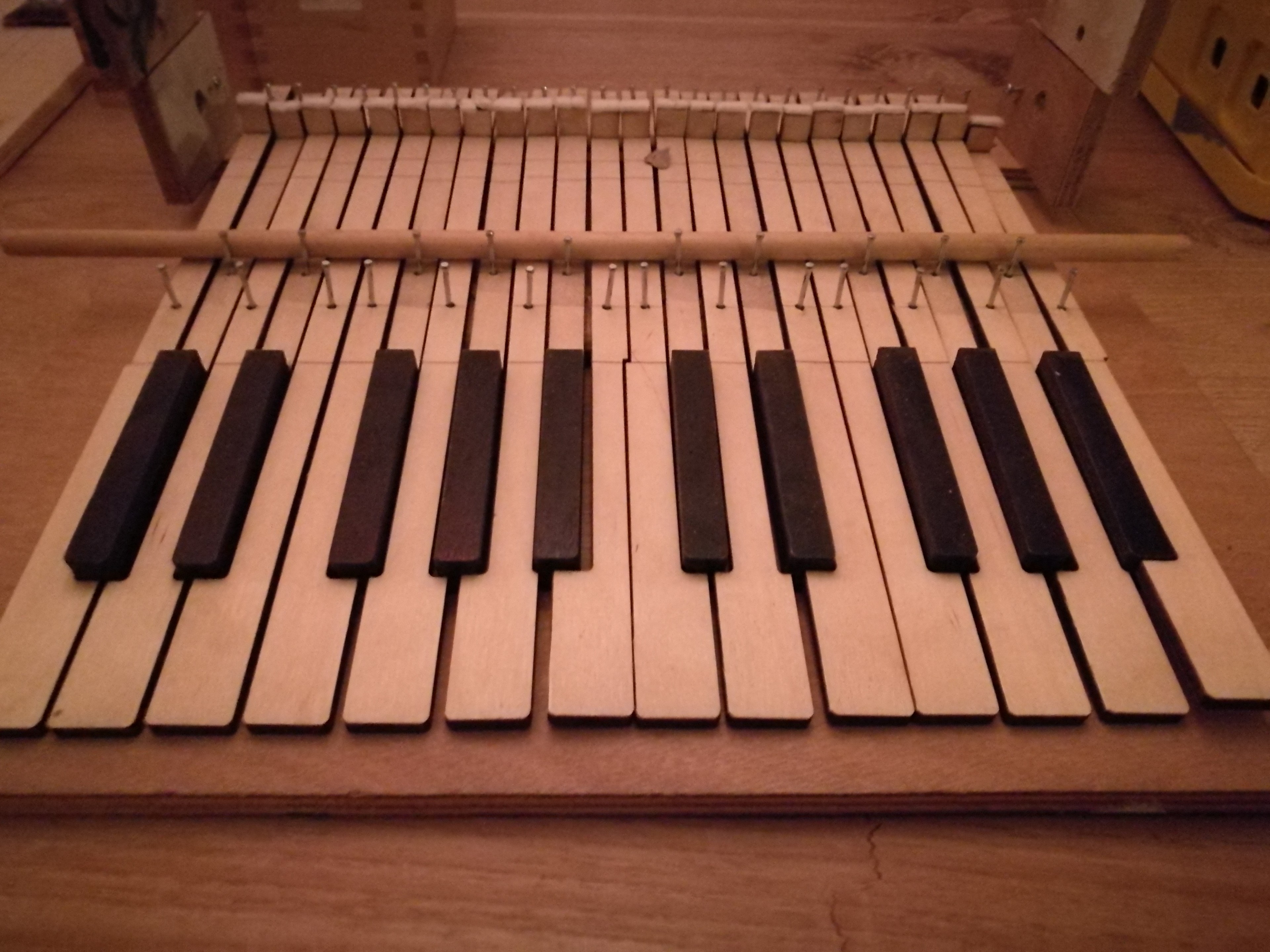 The building ended up being a lot of work. I made precise parts with a lasercutter and plywood, painted keys, tightened strings, and adjusted parts continually. Luckily I had some assistance building the encasement and soldering the electronics.