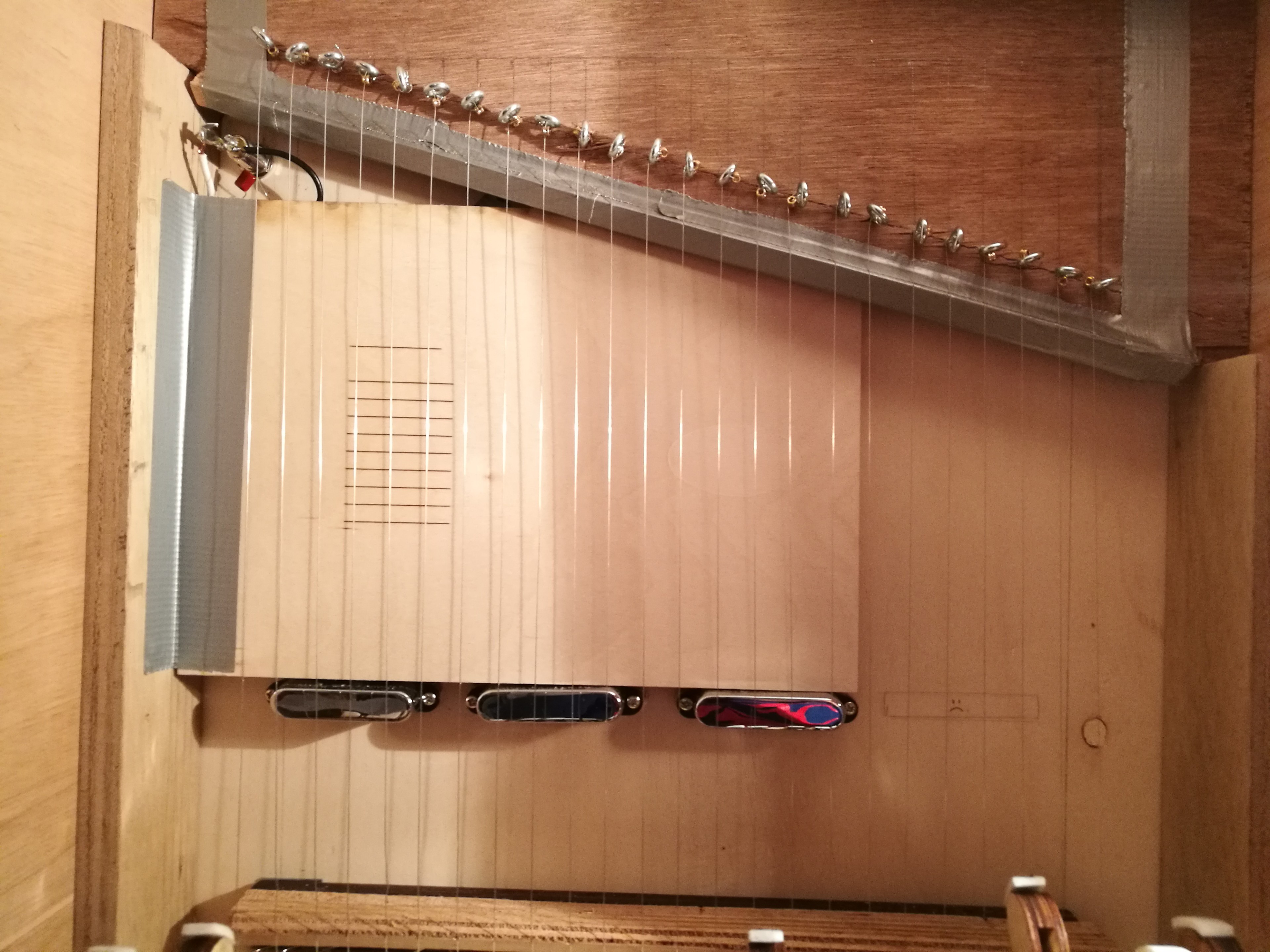 Eventually I chose another idea that I thought suited my guidelines best. I decided to make an instrument that combined an electrical guitar's electronic pickup sensors with the hammer mechanisms of a piano.