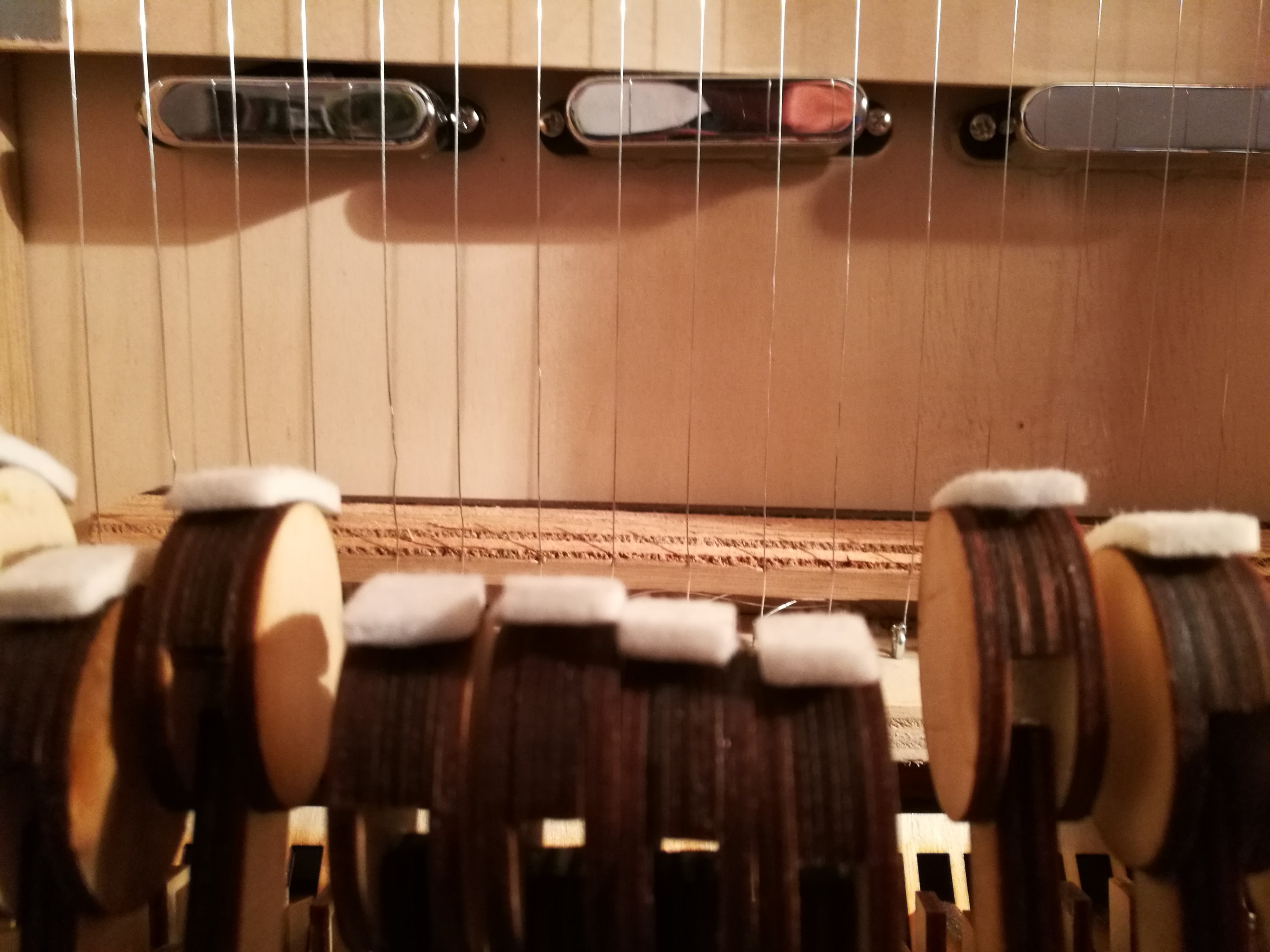 Strings placed on a board, used to test tuning and sensors outside of the instrument