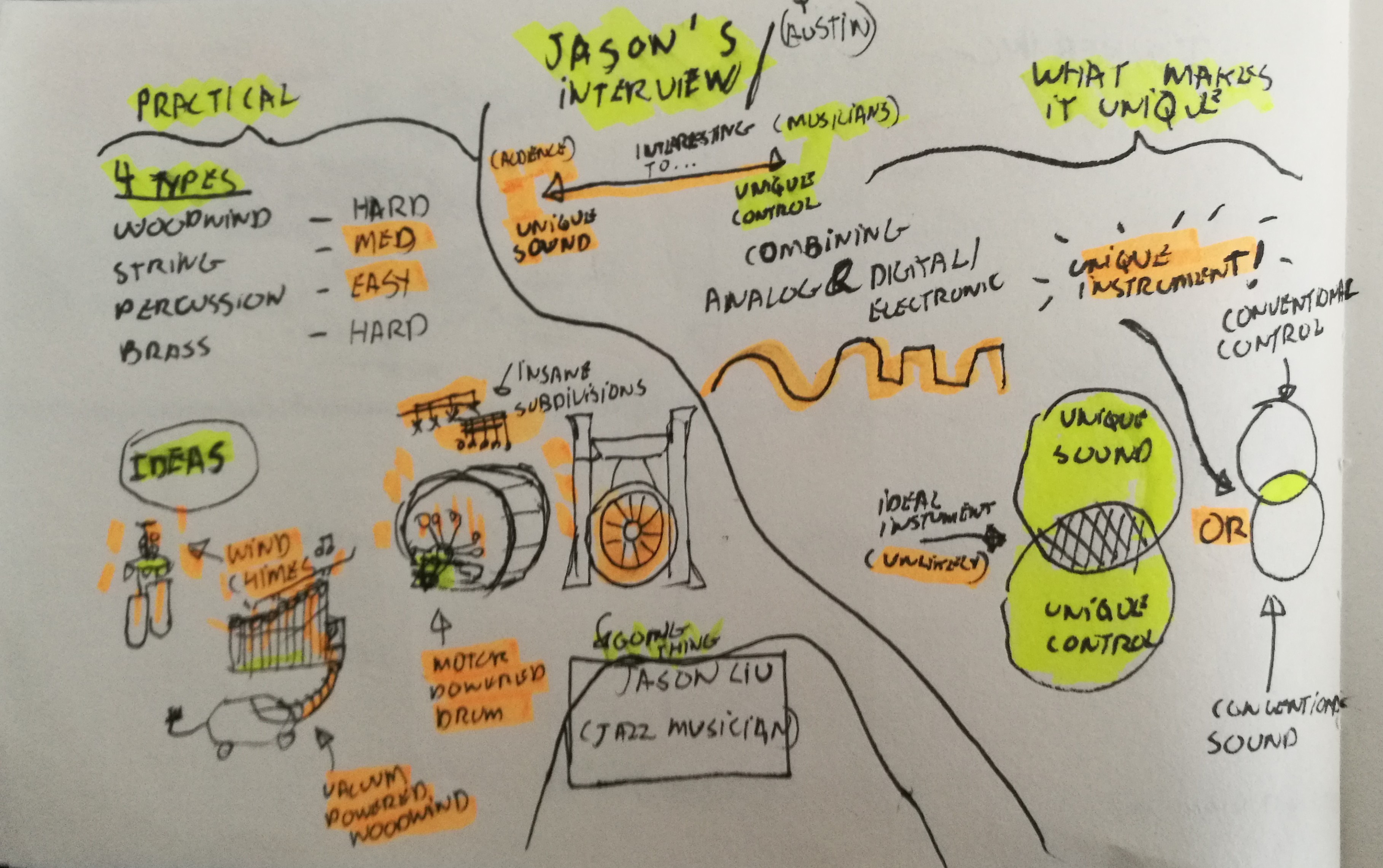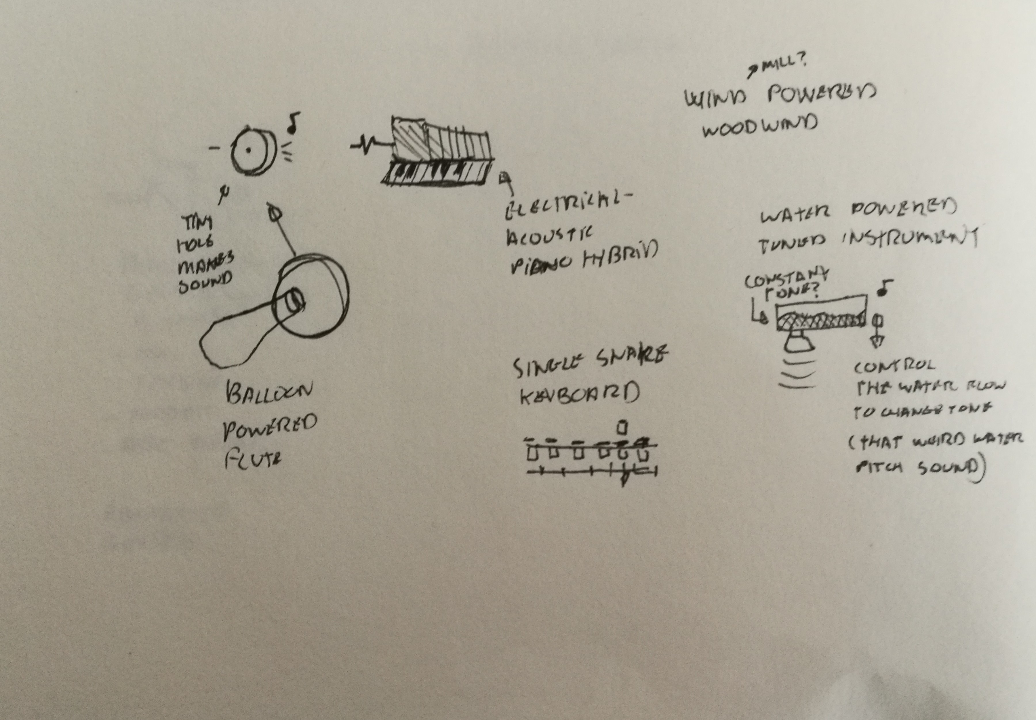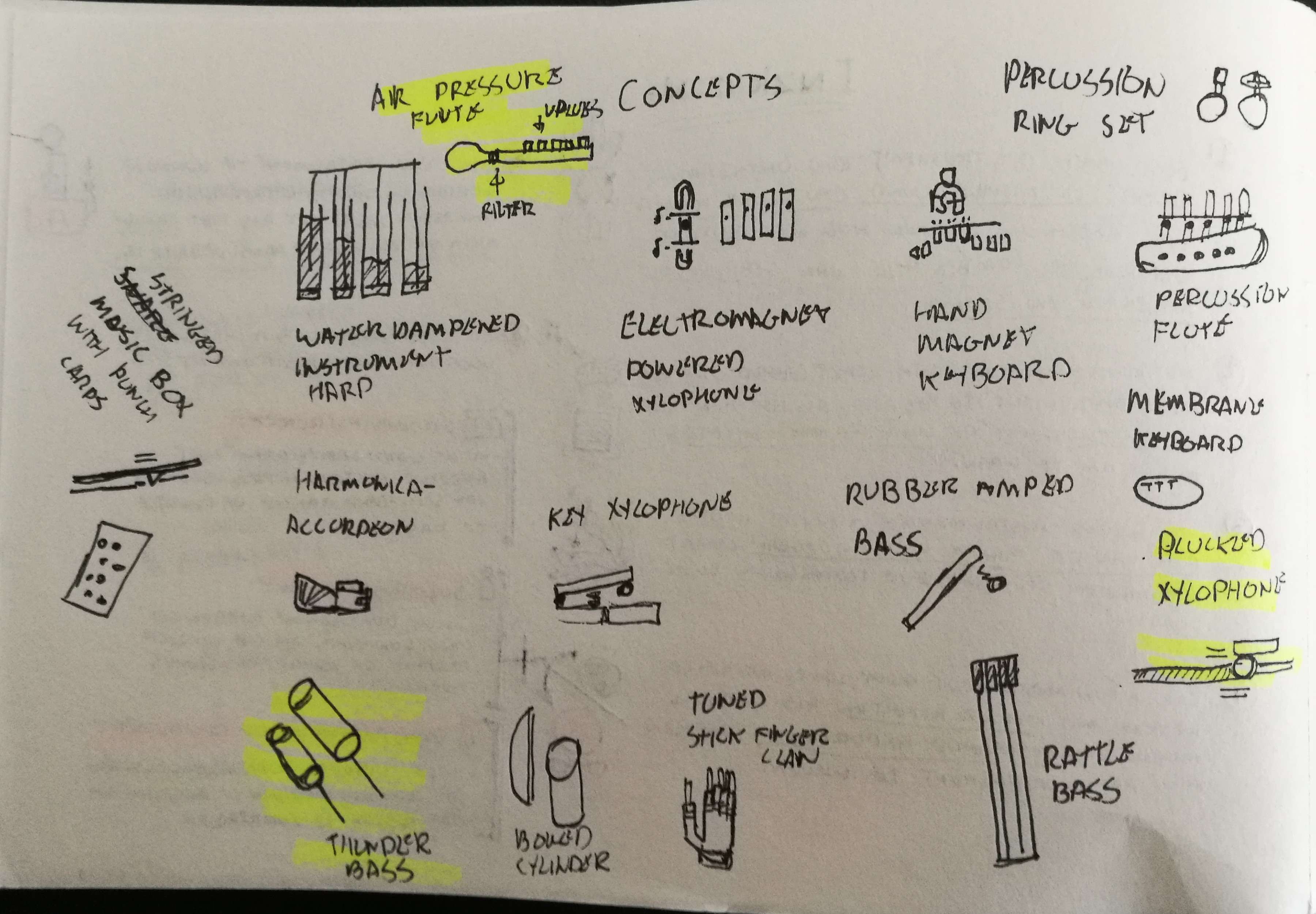 Next I brainstormed to get down as many possible concepts as I could concieve of. Because the first brainstorm didn't yield the amount of ideas I would have liked I took a break to do more research. Then on the second brainstorm I wrote down aspects (materials, functions, sounds) of known instruments on cards and combined them in new ways. This gave me the amount of ideas I was shooting for.